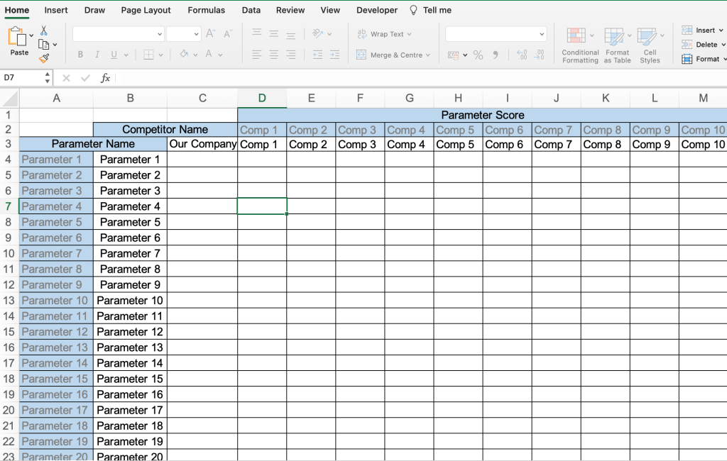 இங்கு ‘Data’ என்ற sheetஇல் உங்கள் parameterகளையும் score ஐயும் பதிவு செய்தால், Graph என்ற sheetஇல் உங்கள் strategy canvas தயார்.